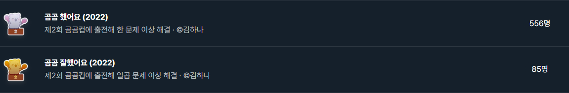 곰곰컵 1솔이상시 "곰곰 했어요 (2022)", 7솔이상시 "곰곰 잘했어요 (2022)" 뱃지가 지급되었습니다.