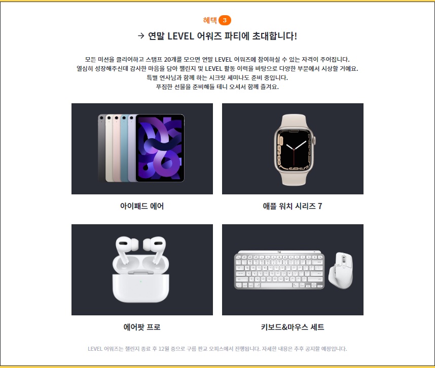 여기서 중요한 것은! 20개를 모아 "LEVEL 어워즈 파티"에 참가자격이 주어진다는 것입니다!