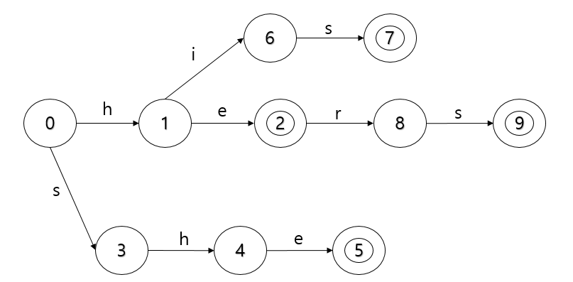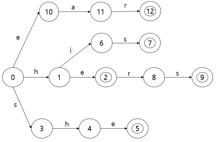 {he, she, his, hers, ear}이라는 단어를 저장한다고 가정하도록 하겠습니다.