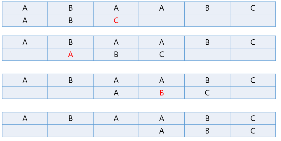 "ABAABC"라는 문자열에 "ABC"라는 단어가 부분 문자열로 존재하는지 체크하는 과정을 단순 반복문을 통하여 진행하게 되면, 맨 앞에 단어부터 해당 형식으로 진행하게 됩니다.