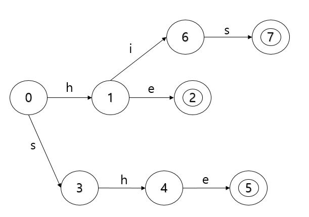 sheas이라는 단어로 진행을 하게 되면, s,h,e를 통해 5번 노드에 도착하였으나, a이라는 단어로 갈 수 있는 노드가 없습니다. 그래서 root 노드로 부터 h,e라는 문자를 통해 갈 수 있는 2번 노드를 fail node로 가리키게 됩니다.